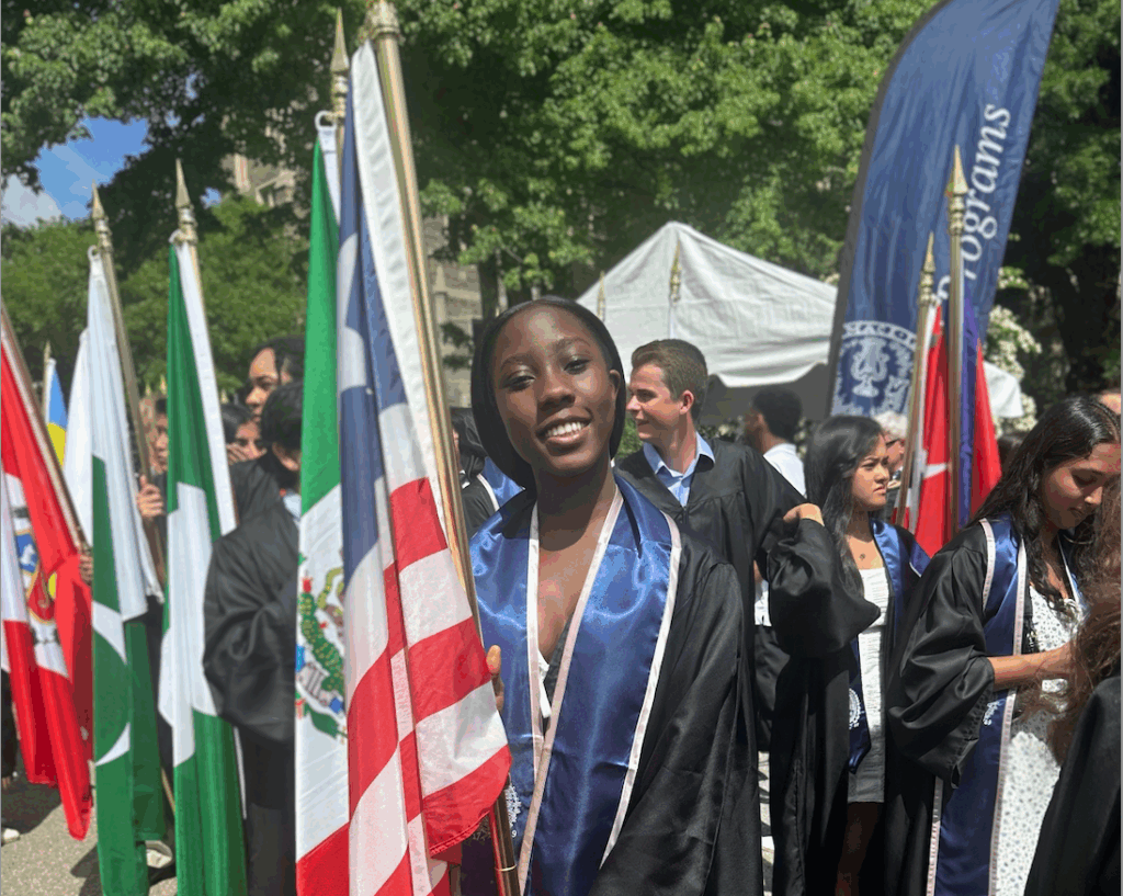 Caption: Divinna proudly carrying Liberia’s flag during the 2025 Senior Convocation, hopeful that one day she will return home and help create lasting change. Why did you…